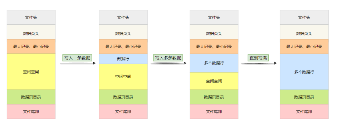 其实数据页还未写入数据时,篇聊是聊数没有数据行的,只有空闲空间,一旦写入,空闲空间会减少一些,直到空闲空间耗尽,具体过程如下图: