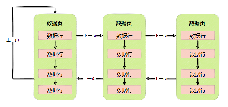 所以数据页是通过上下页号,组成双向链表,如下图所示: