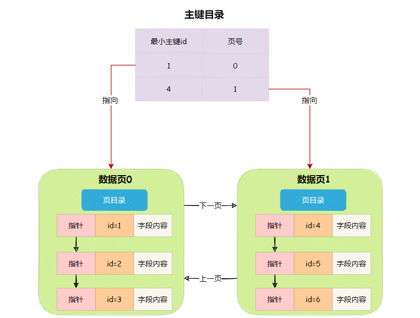 数据页0的id=6行数据挪到数据页1数据页1的页目录更新数据页1的id=3行数据挪到数据页0数据页0的页目录更新好了,现在我们以主键为例,创建一个主键索引,这个主键索引就是主键目录,它会维护所有数据页的最小主键值与对应的页号。