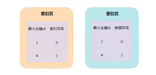 索引页会存储两类内容,一类是最小主键值与索引页号,另一类是最小主键值与数据页号。