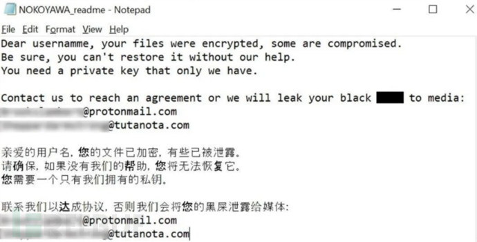 被勒索软件加密的文件会附加一个.NOKOYAWA扩展名。赎金记录被写入每个包含用于加密的目录中的NOKOYAWA_readme.txt中。