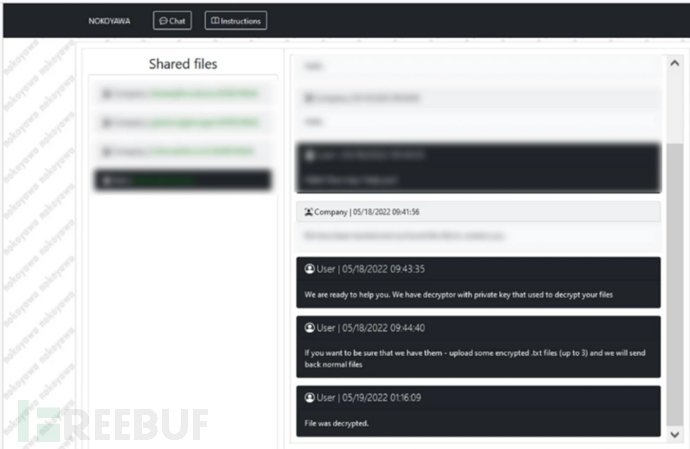 新的赎金付款页面访问Onion URL会进入一个带有在线聊天框的页面,用于与运营商进行沟通以协商和支付赎金。研究人员观察到可能的受害者(公司)和勒索软件运营商(用户)之间的持续对话。根据此聊天记录,威胁参与者提供最多3个文件的免费解密,以证明他们可以解密受害者的文件,如图4所示: