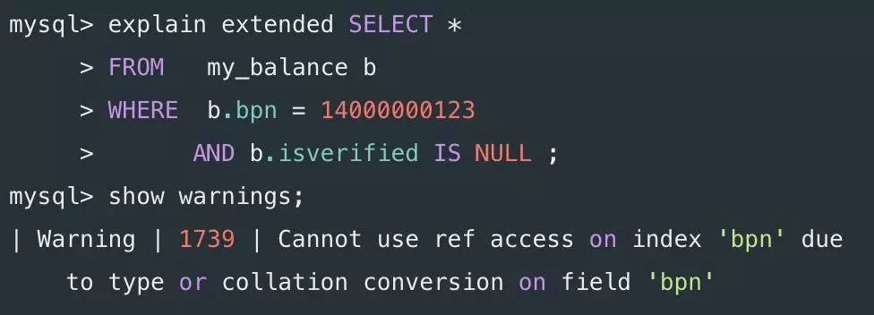 其中字段 bpn 的定义为 varchar(20),MySQL 的策略是将字符串转换为数字之后再比较。函数作用于表字段,索引失效。上述情况可能是应用程序框架自动填入的参数,而不是程序员的原意。现在应用框架很多很繁杂,使用方便的同时也小心它可能给自己挖坑。