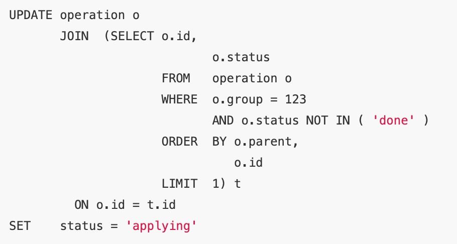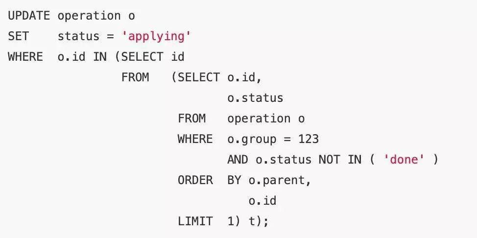 比如下面 UPDATE 语句,MySQL 实际执行的是循环/嵌套子查询(DEPENDENT SUBQUERY),其执行时间可想而知。