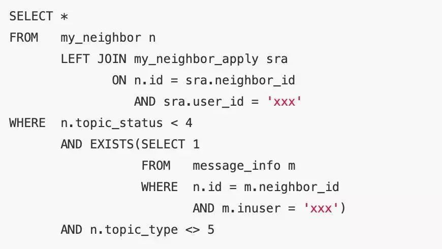 MySQL 对待 EXISTS 子句时,仍然采用嵌套子查询的执行方式。如下面的 SQL 语句: