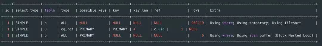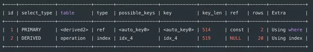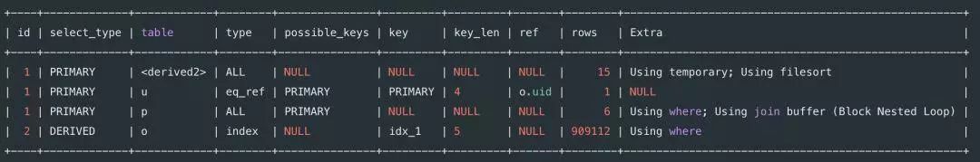 再检查执行计划:子查询物化后(select_type=DERIVED)参与 JOIN。虽然估算行扫描仍然为90万,但是高防服务器利用了索引以及 LIMIT 子句后,实际执行时间变得很小。