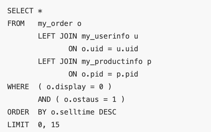 由于最后 WHERE 条件以及排序均针对最左主表,因此可以先对 my_order 排序提前缩小数据量再做左连接。SQL 重写后如下,执行时间缩小为1毫秒左右。