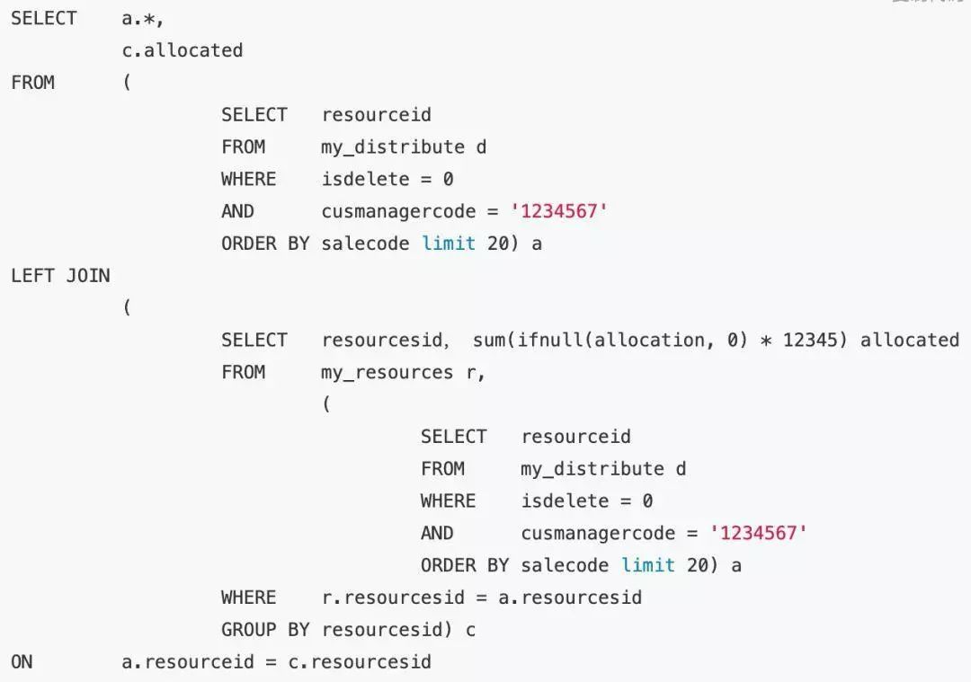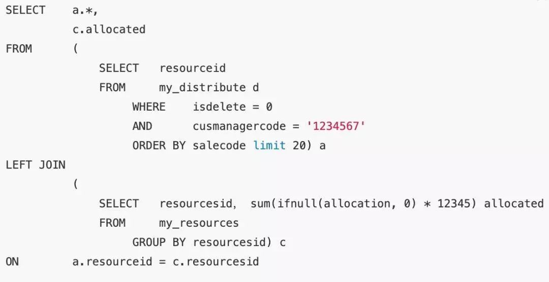 那么该语句还存在其它问题吗?不难看出子查询 c 是全表聚合查询,在表数量特别大的情况下会导致整个语句的性能下降。