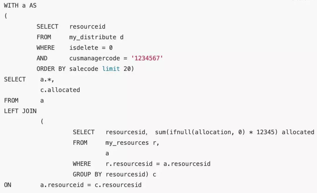 但是子查询 a 在我们的SQL语句中出现了多次。这种写法不仅存在额外的开销,还使得整个语句显的繁杂。使用 WITH 语句再次重写: