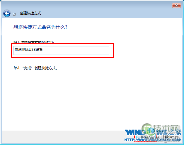 3、桌面在“键入该快捷方式的快捷名称”文本框中输入“快速删除USB设备”也可以自定义个人喜欢的名称,服务器托管点击“完成”按钮。键安如图三