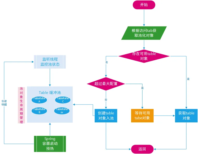 4.2 连接池使用和连接预热HBase Connection 创建对象并不是简单对应一个socket连接,需要与Zookeeper以及HMaster、RegionServer都建立连接,所以该过程是一个非常耗资源的过程,一般只创建一个 Connection 实例,其它地方共享该实例。在Connection初始化之后,用connection下的getTable方法实现对表格的连接。为了减少与表格连接带来的网络开销,我们建立了对不同表格的连接池来管理客户端和服务端的连接。大致流程图如下图所示。