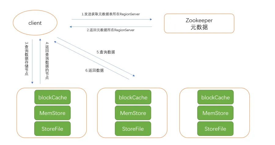 客户端从ZooKeeper中获取meta表所在regionServer节点信息。客户端访问meta表所在的regionServer节点,获取region所在节点信息。客户端访问具体region所在regionServer,找到对应的region。首先从blockCache中读取数据,存在则返回,不存在则去memstore中读取数据,存在则返回,不存在去storeFile(HFile)中读取数据,存在会先将数据写入到blockCache中,然后返回数据,不存在则返回空。简单的示意图如下所示: