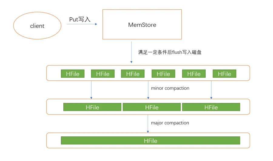 4.4 compact优化HBase是基于LSM树存储模型的分布式NoSQL数据库。LSM树相比于普遍使用在各种数据库的B+树来说,能够获得较高随机写性能的同时,也能保持可靠的随机读性能。在进行读请求的时候,LSM树要把多个子树(类似B+树结构)进行归并查询, 因此归并查询的子树数越少,查询的性能就越高。当MemStore超过阀值的时候,就要flush到HDFS上生成一个HFile。因此随着不断写入,HFile的数量将会越来越多,根据前面所述,HFile数量过多会降低读性能。为了避免对读性能的影响,可以对这些HFile进行compact操作,把多个HFile合并成一个HFile。compact操作需要对HBase的数据进行多次的重新读写,因此这个过程会产生大量的IO。可以看到compact操作的本质就是以IO操作换取后续的读性能的提高。
