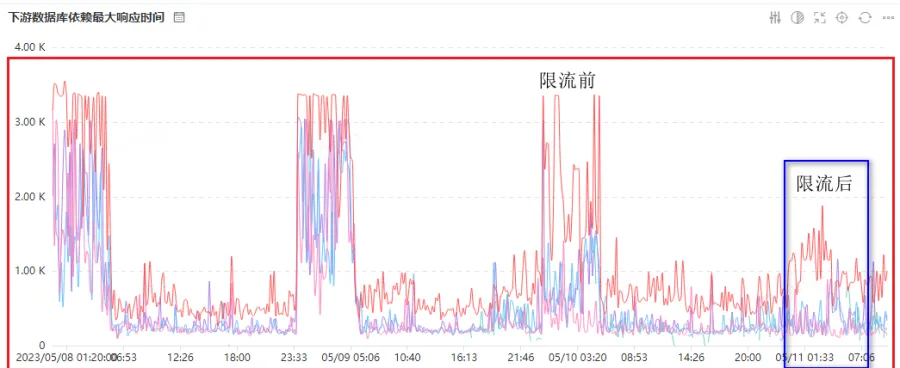 hbase.hstore.compaction.throughput.lower.bound也是HBase中控制HFile文件合并速度的参数之一。它指定了一个HFile文件每秒最小合并数据大小的下限,以字节为单位。当合并速度达到这个下限时,HBase会停止合并更小的HFile文件,而等待更多的数据到达之后再进行合并操作。与higher.bound参数相比,lower.bound参数更加影响文件合并频率和性能。过高的值会导致较少的文件合并和较大的HFile文件,这会影响读取性能和写入并发性。反之,过低的值会导致过于频繁的文件合并,从而占用过多的CPU和磁盘I/O资源,影响整个HBase集群的性能。针对Compact对业务耗时的影响,我们对Compact 操作进行了限流,并且通过多次测试调整Compact上文提到的两个限流的阈值,取得了非常好的效果。Compact期间的耗时下降了70%y以上。下图展示了采取限流前后的耗时对比。