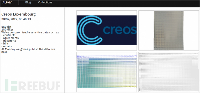 BlackCat再次发动攻击ALPHV/BlackCat勒索软件集团周六将Creos加入其勒索网站,威胁要公布18万个被盗文件,总大小为150GB,包括合同、协议、护照、账单和电子邮件。虽然没有宣布实现这一威胁的确切时间,但该勒索软件集团宣称要在周一的晚些时候进行披露。