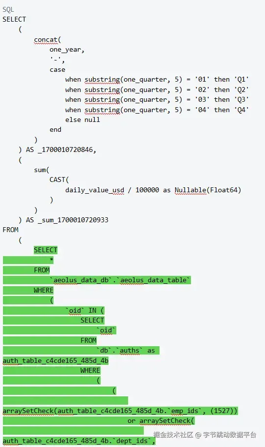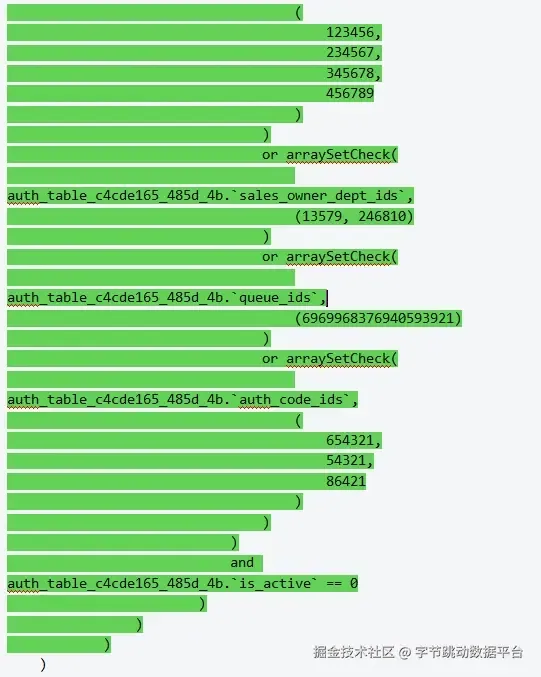 绿色部分为SQL改动,通过引入子查询的方式,使用户无权限数据过滤,保证用户鉴权最新状态。