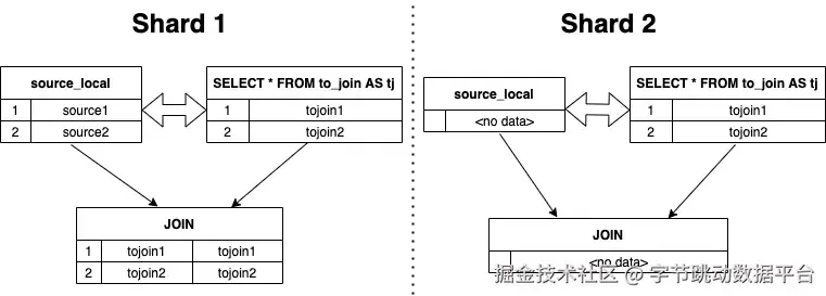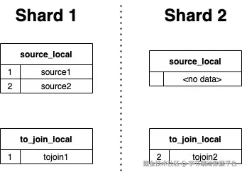 两张分布式表source和to_join(对应local表分别是source_local和to_join_local)数据分布在两个分片上,如下图: