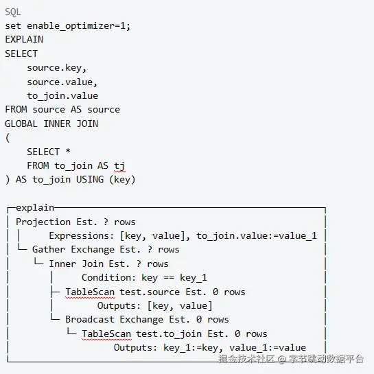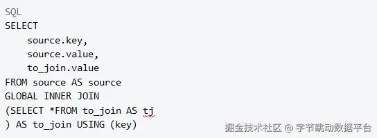 如果分片数目为N,右表表达式的分布式表to_join在一次join中就会被重复查询N次,导致效率低下。为了解决该问题,我们采用Global Join,或者设置distributed_product_mode=global,引擎会自动将分布式表的join改写成Global Join。
