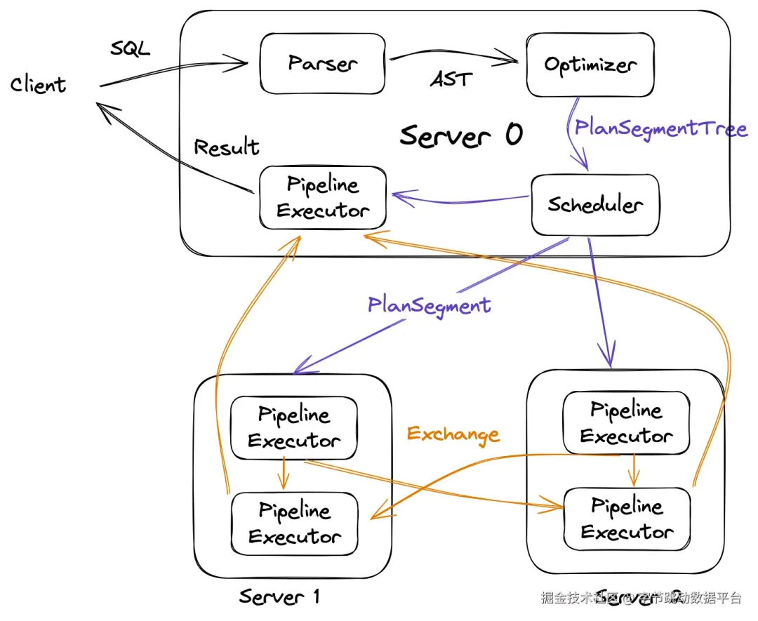 开启优化器后,执行模式由原来的Scatter/Gather模型切成了完全MPP模型。整个SQL的执行流程如下图所示(以3节点的集群为例)