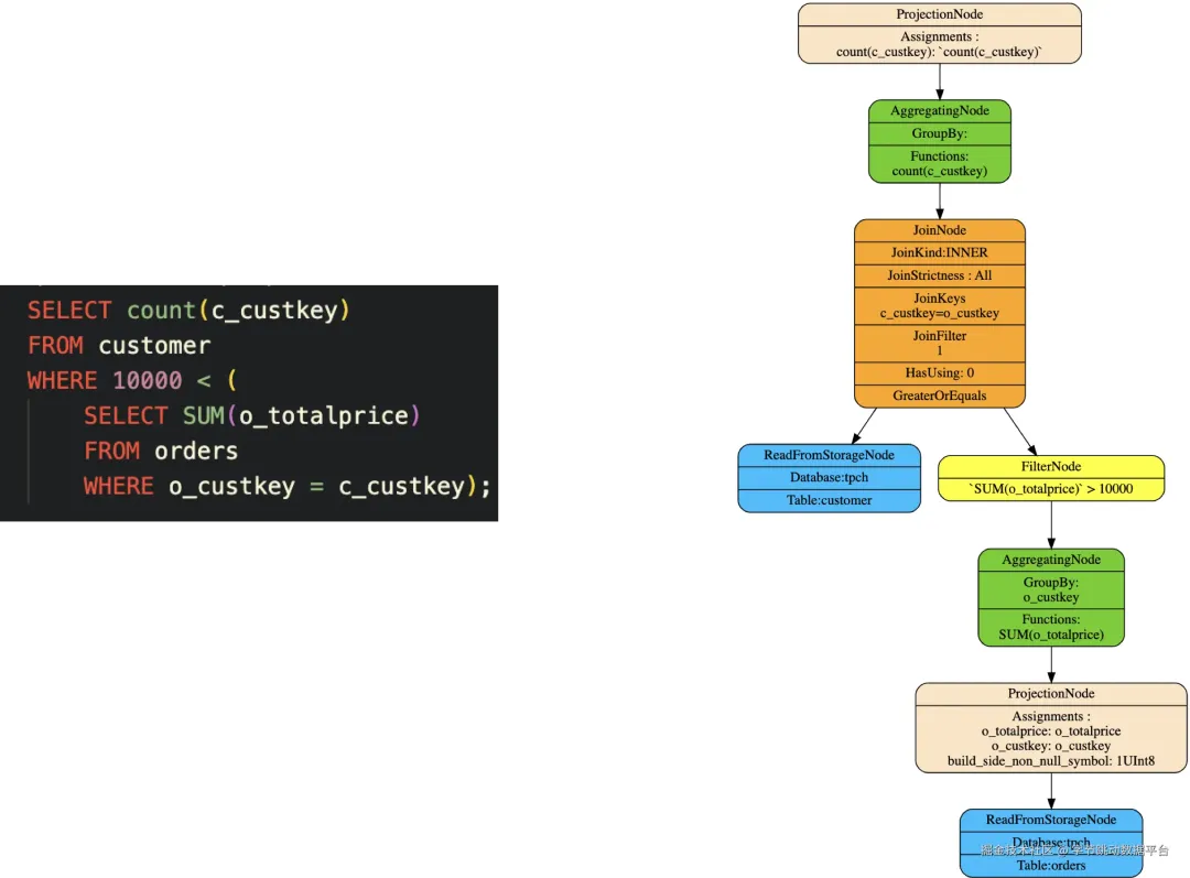 优化三:分布式计划优化业界主流实现分为两个阶段,首先寻求最优的单机版计划,然后将其分布式化。但是这样的设计流程,不能提前考虑分布式系统的特点,可能会导致网络延迟、数据分布不均衡,并导致可扩展性限制等问题。我们的方案则是将这两个阶段融合在一起,在整个 CBO 寻求最优解的过程中,会结合分布式计划的诉求,从代价的角度选择最优的分布式计划,同时在 Join/Aggregate 过程中,也支持 Partition 属性展开。