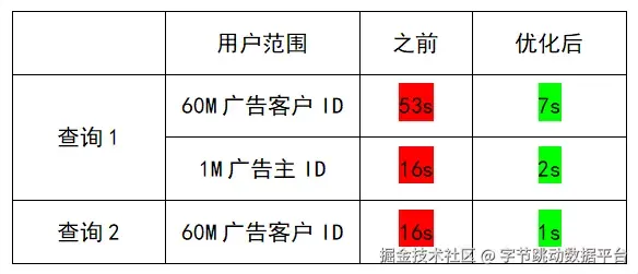 通过非ACL查询和ACL查询两个方向,我们可以看到查询时间在优化前后有显著提升。其中,在ACL查询中的60M广告客户DI场景中,引入ByteHouse之后将查询效率从16s缩短为秒级,提升了16倍。