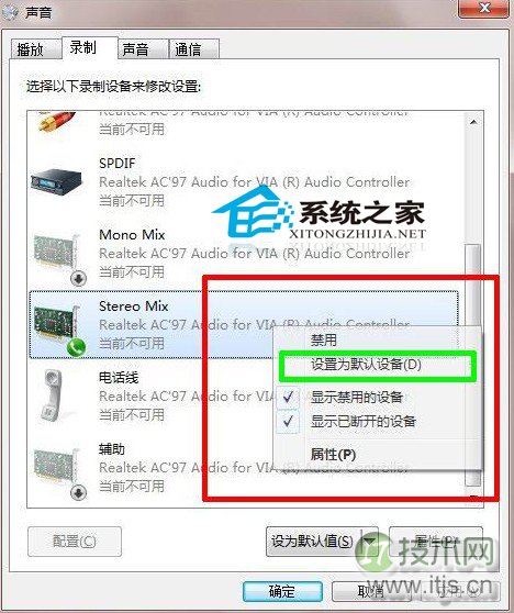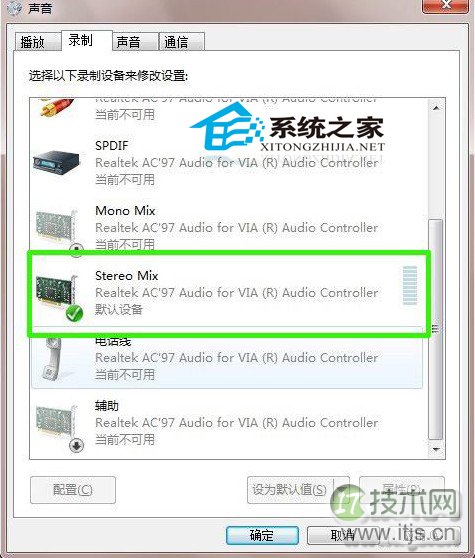 5、此时stereo mix选项已经成为默认设备,已经可以使用了。