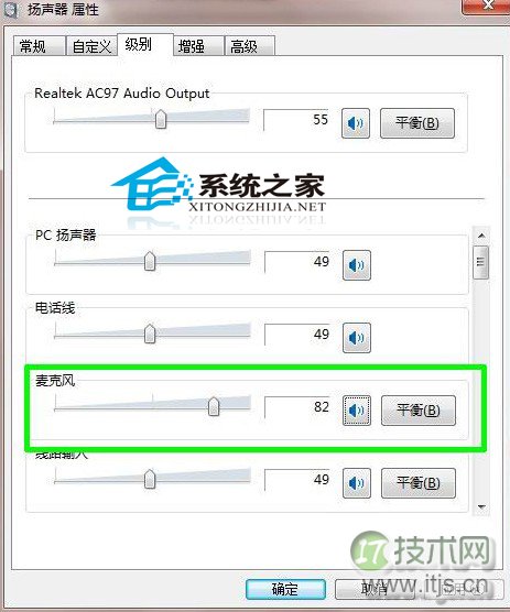 9、选择“级别”栏目,这时我们往往发现麦克风那项被静音,这时我们去掉静音,并调整好麦克风音量。调整完毕,点击确定。