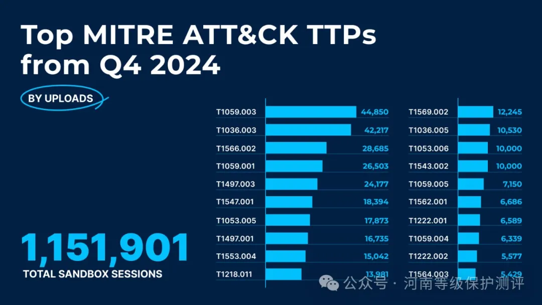 攻击者在第四季度利用了多种先进技术,其中 Windows 命令 Shell (T1059.003) 以 44,850 次检测位居榜首。服务器托管其他突出的技术包括: