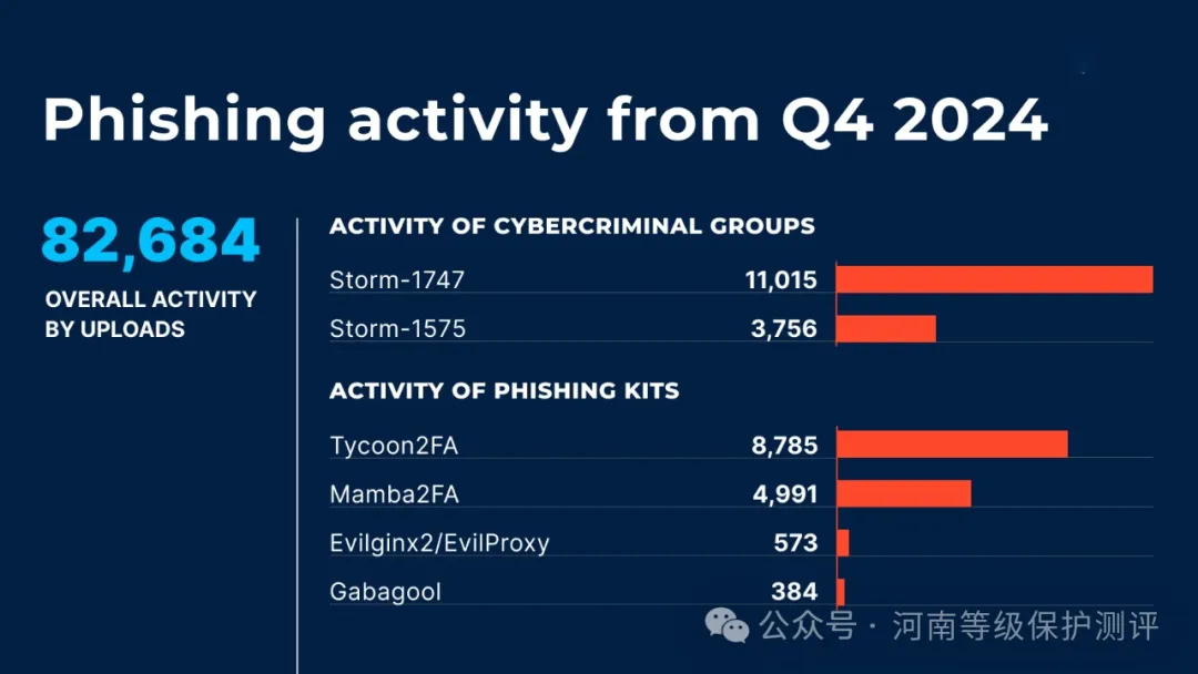 2024年第四季度,网络钓鱼活动激增,共标记了 82,684 个与网络钓鱼相关的威胁。主要亮点包括: