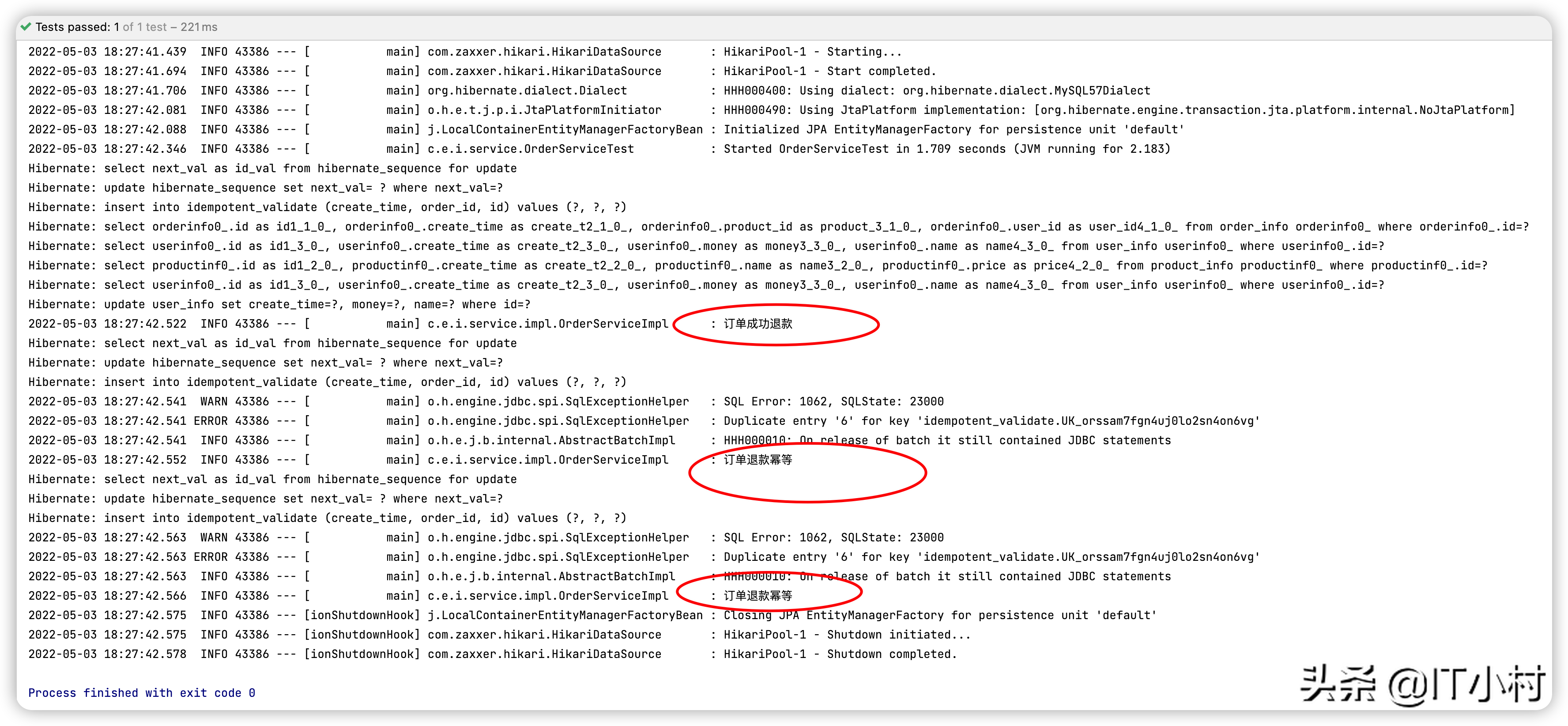 public void cancelOrderTest() { orderService.cancelOrder(6L); orderService.cancelOrder(6L); orderService.cancelOrder(6L); }}1.2.3.4.5.6.7.8.9.10.11.12.13.14.15.16.17.18.19.20.21.22.可以看到,只有第一次是亿华云计算退款成功的,后面2次触发幂等性,退款失败,符合我们的预期。