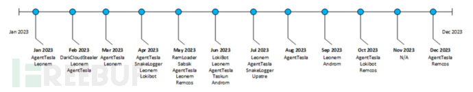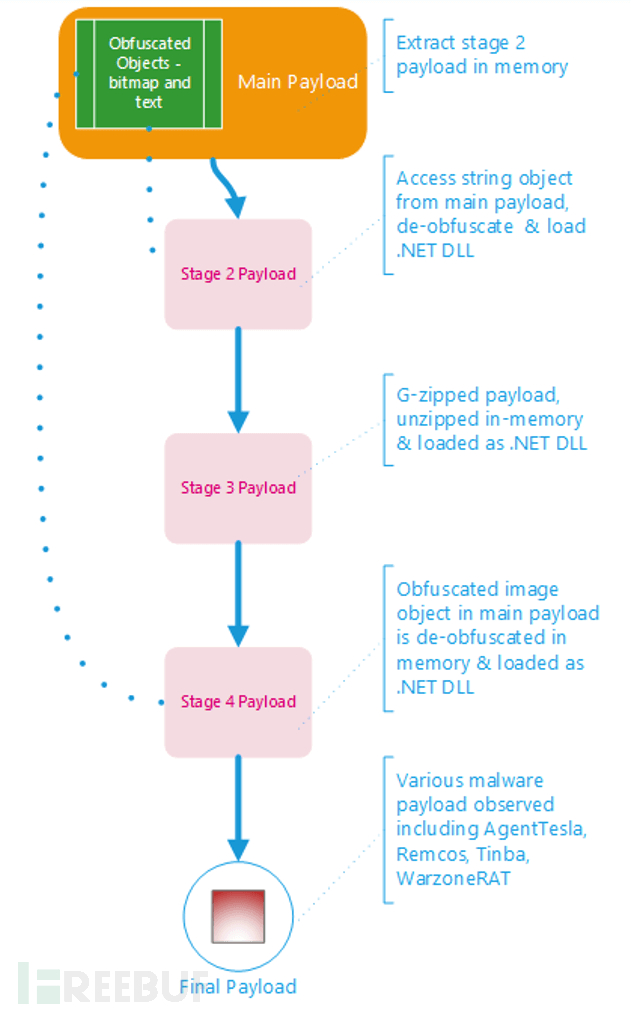 这些投放器在加载和初始执行期间对最终有效载荷进行了混淆,新型包括Leonem、上传AgentTesla、播恶SnakeLogger、意软LokiBot、黑客Remcos、利用RemLoader、新型Sabsik、Taskun、Androm和Upatre。