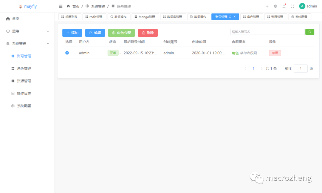在账号管理中我们可以对账号进行管理,支持角色分配;