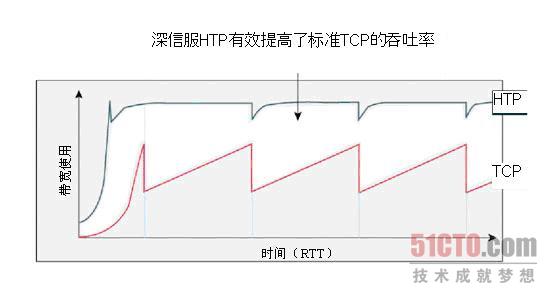 在广域网上进行数据传输时,由于受到传统传输协议的影响,数据传输速度很不稳定,并且当网络出现拥塞、丢包的情况时,传输效率会降低到实际带宽的30%甚至更低。HTP高速传输协议通过选择性应答、快速重传技术、窗口处理机制优化和拥塞控制优化技术,有效的改善了广域网链路上的数据传输,其加速效果如下图所示:
