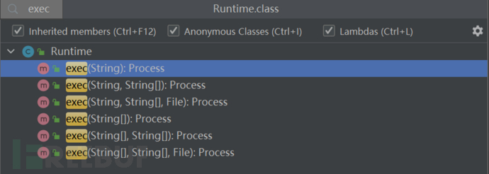在Runtime类中的exec方法存在有多个重载,大致可以分成传入的参数是一个字符串,或者是一个字符串数组进行命令执行。