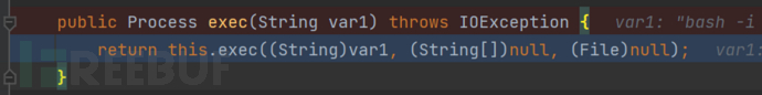 在这个方法中将会调用this.exec((String)var1, (String[])null, (File)null)方法继续进行调用。