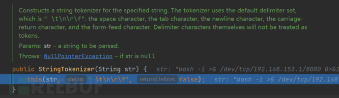 在这个方法中,首先是传入的命令不能为空,不然会抛出异常,之后主要是创建了一个StringTokenizer对类对象,传入的构造方法参数是我们需要执行的命令字符串。