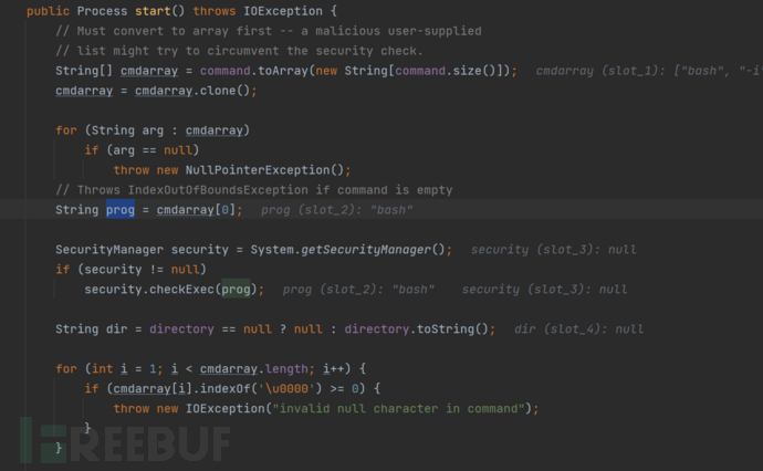 可以注意到在其后面有一个System.getSecurityManager方法的调用,这个就是通过调用checkExec方法来判断该次的命令调用是否合法,也是Java内置的一种安全管理。