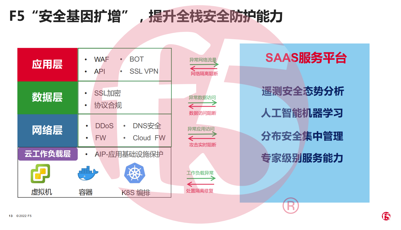 第三是部署多样性,这来自于F5多年发展中不断地打磨和创新,目前F5的安全产品已经能够部署在公有云、私有云、边缘云、容器云等环境中。