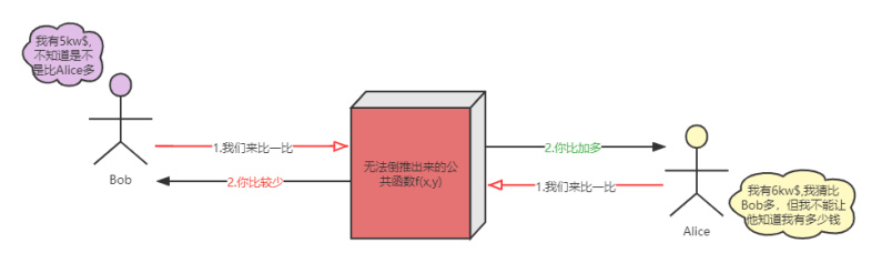 有两个百万富翁Alice和Bob,他们想比一比两个人谁的财富更多,但是由于财产是比较隐私的问题,因此两个人都不想向对方透露自己有多少财富;并且他们也不信任任何第三方。在这种前提下,该如何解决这个难题呢?