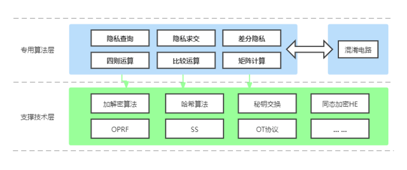 安全多方计算不是一种单一的技术,它是由一系列技术组成的集合,这些技术能帮助数据参与方在不泄露己方原始数据的前提下获取到需要的整体数据信息。通用组成结构有以下两层: