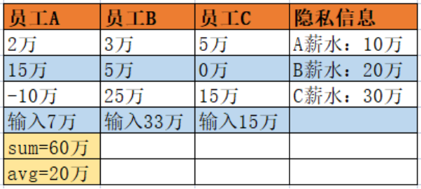 假设A工资10万,他把自己的薪资信息拆分后,分发给了B(3万)和C(5万),B和C进行相同逻辑拆分,最后这些秘密分享的数据共同计算得到了正确结果。