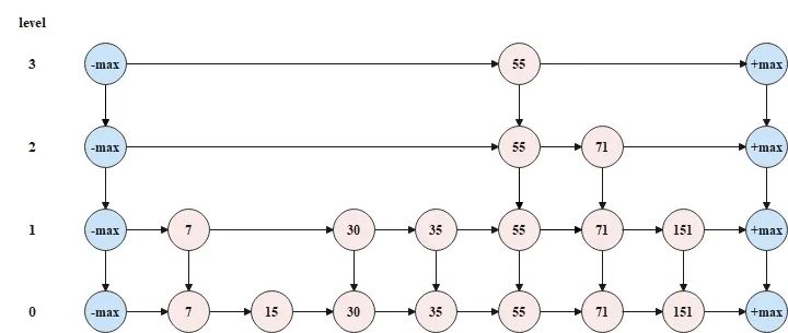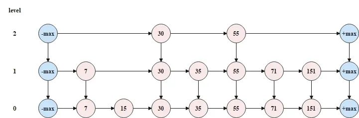 •跳表头节点和尾节点不存储元素,且头节点和尾节点的层数就是跳表的最大层数;