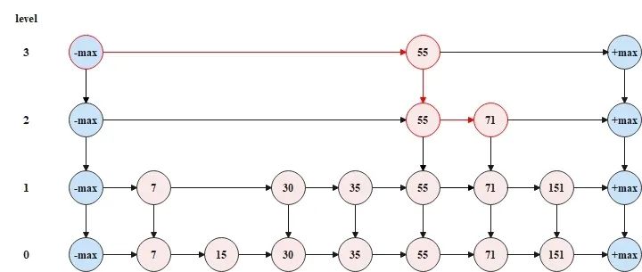 preNode = preNode.down; }}private void expanLevel(int expanCount) { SkiplistNode head = headNodes.getFirst(); SkiplistNode tail = tailNodes.getFirst(); for (int i = 0; i < expanCount; i++) { SkiplistNode headNew = new SkiplistNode(Integer.MIN_VALUE, head.level + 1); SkiplistNode tailNew = new SkiplistNode(Integer.MAX_VALUE, tail.level + 1); headNew.down = head; tailNew.down = tail; head = headNew; tail = tailNew; headNodes.addFirst(head); tailNodes.addFirst(tail); }}1.2.3.4.5.6.7.8.9.10.11.12.13.14.15.16.17.18.19.20.21.22.23.24.25.26.27.28.29.30.31.32.33.34.35.36.37.38.39.40.41.42.43.44.45.46.47.48.49.50.51.52.53.在跳表中搜索一个元素时,需要从顶层开始,逐层向下搜索。搜索时遵循如下规则。