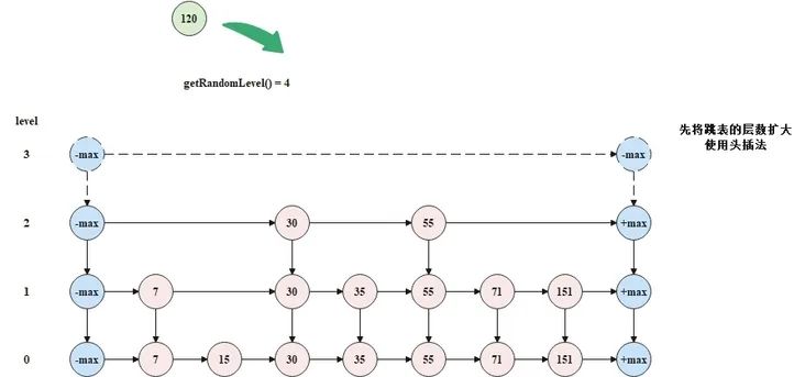 现在要往跳表中添加元素 120,并且随机指定的层数为 3,大于了当前跳表的层数 2,此时需要先扩大跳表的层数,2如 下图所示。