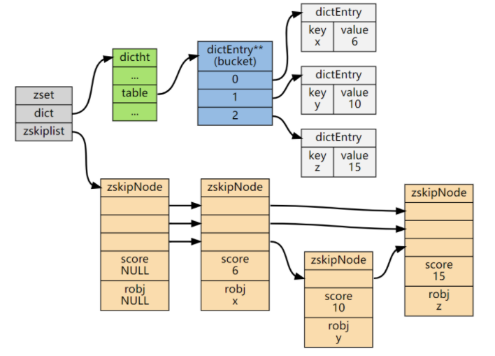 复制typedef struct zset { dict *dict; zskiplist *zsl;} zset;1.2.3.4.ZSet中的字典和跳表布局: