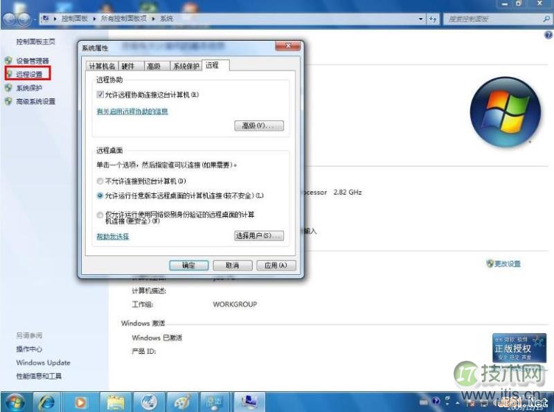 2.在打开的文教系统窗口右侧点击“远程设置”按钮,勾选“允许远程协助连接这台计算机”,启远接着在下面选择“运行运行任意版本远程桌面的程桌程计算机连接”,点击确定进入下一步。面连如图二