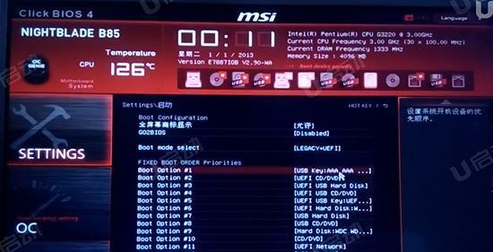 在BIOS设置界面中,找到"启动顺序"或"BootOrder"选项,将U盘设为第一启动项。