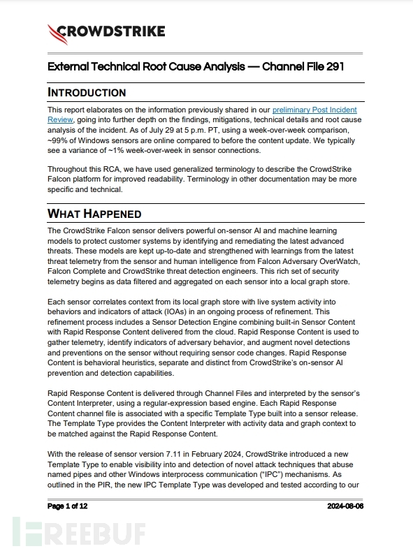 根据这份名为“通道文件 291事件”(Channel File 291 Incident)的报告内容分析,CrowdStrike 于今年2月为识别并修复最新高级威胁的历史Falcon 传感器发布了7.11版本,其中包括了用于Windows 进程间通信 (IPC) 机制的被全新模板类型,该模板实例通过编号为 291 的球网相应通道文件作为快速响应内容交付给传感器,以便查看并检测滥用命名管线及其他 Windows 进程间通信(IPC)机制的新型攻击技术。