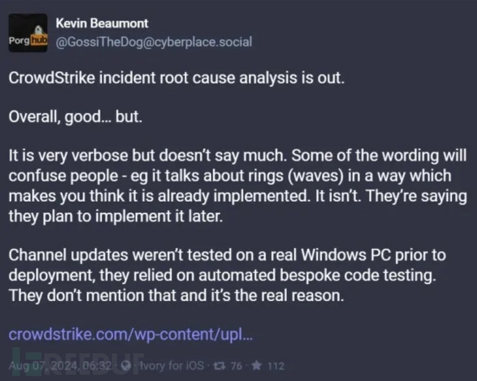 微软独立安全研究员Kevin Beaumont表示,“CrowdStrike 在部署之前,频道更新没有在真实的 Windows PC 上进行测试,它们依赖于自动化的定制代码测试。服务器托管这一点在报告中没有提及,而这才是导致事故的真正原因。“