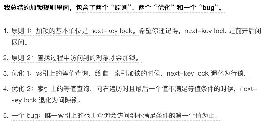 这里的加锁规则,我直接引用丁奇老师的总结:两个原则、两个优化、一个 bug。